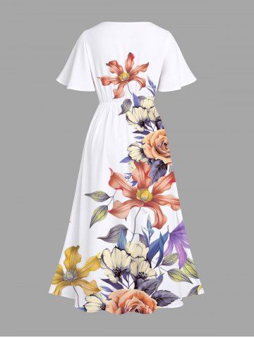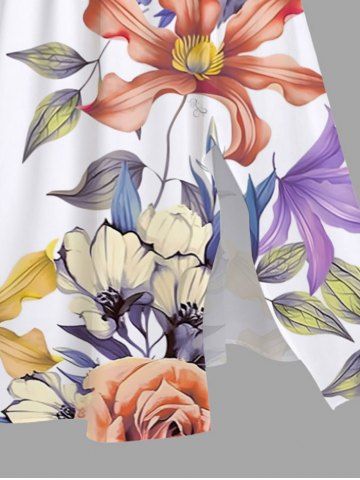 Plus Size Colorful Floral Leave Branch Print Hawaii Split Pocket A Line Midi Dress - White - 2x