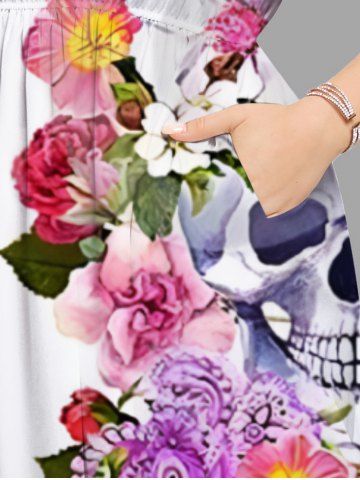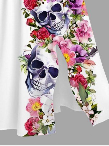 Plus Size Colorful Flower Skull Print Hawaii Split Pocket A Line Midi Dress - White - 2x