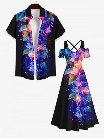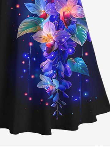 Plus Size Colorful Flowers Leaf Galaxy Glitter 3D Print Cold Shoulder Crisscross Maxi Dress - Black - S