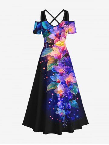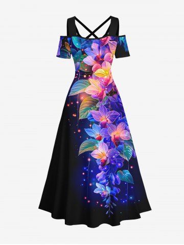 Graphic Dresses > Plus Size Colorful Flowers Leaf Galaxy Glitter 3D Print Cold Shoulder Crisscross Maxi Dress