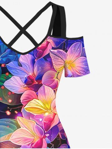 Graphic Dresses > Plus Size Colorful Flowers Leaf Galaxy Glitter 3D Print Cold Shoulder Crisscross Maxi Dress