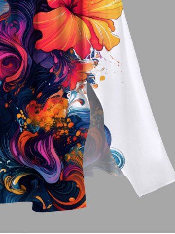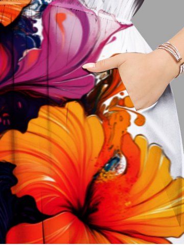 Plus Size Colorful Flowers Paint Splatter Print Split Hawaii Midi Dress - White - L