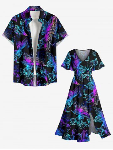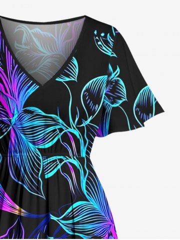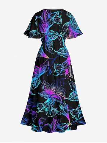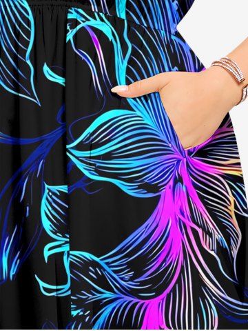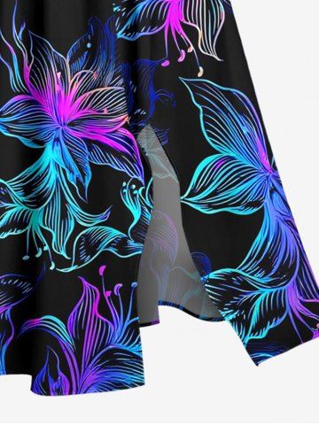 Plus Size Colorful Flowers Print Split Hawaii Midi Dress - Black - Xxs