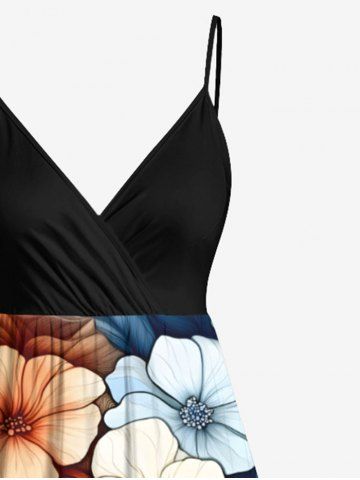 Plus Size Colorful Flowers Print Surplice Hawaii Cami Dress - Black - S