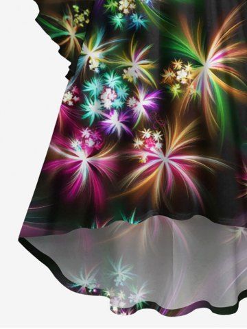 Plus Size Colorful Glitter Fireworks Floral Print Party New Years Eve Ruched High Low Asymmetric Dress - Black - 3x