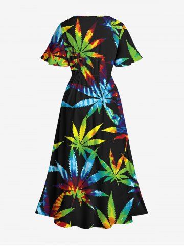 Plus Size Colorful Maple Leaf Print Split Hawaii Midi Dress - Black - 5x
