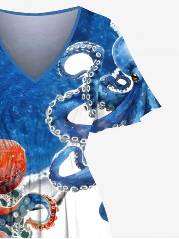 Plus Size Colorful Octopus Sea Waves Print Hawaii Split Pocket A Line Midi Dress - Sky Blue - Xs
