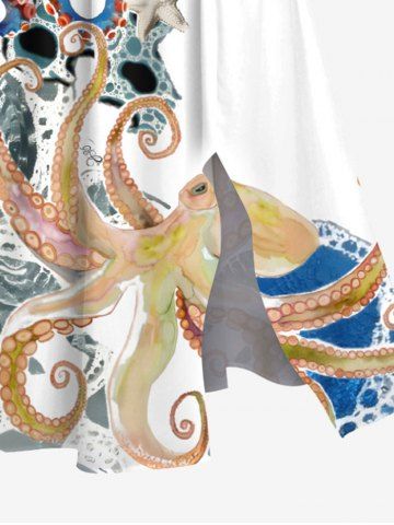 Graphic Dresses > Plus Size Colorful Octopus Sea Waves Print Hawaii Split Pocket A Line Midi Dress