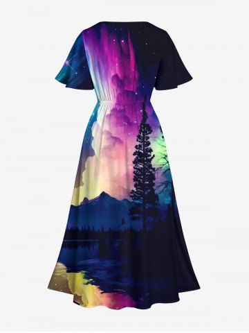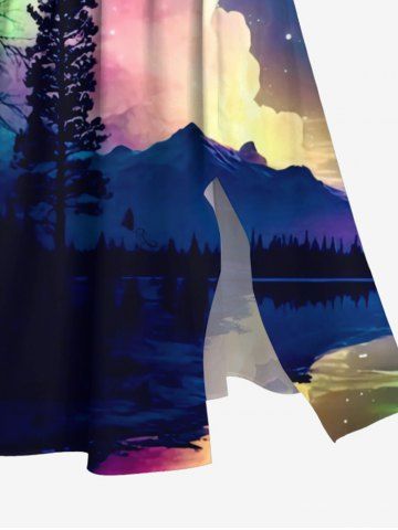 Plus Size Colorful Ombre Aurora Cloud Galaxy Tree Mountain Lake Print Hawaii Split Pocket A Line Midi Dress - Multi-a - 5x