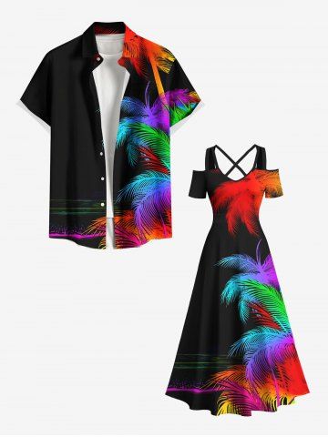 Plus Size Colorful Ombre Coconut Tree Tropical Leaves Print Hawaii Cold Shoulder Crisscross A Line Maxi Dress - Black - 1x