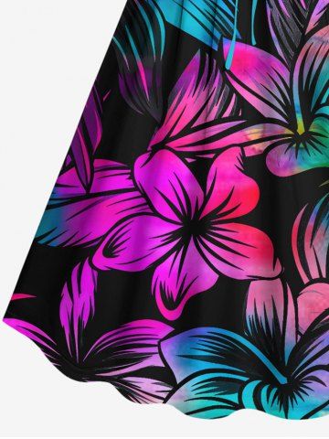 Plus Size Colorful Ombre Hibiscus Flower Print Hawaii Cinched A Line Dress - Black - 5x