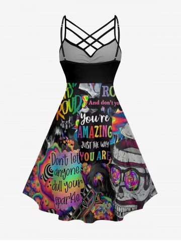 Graphic Dresses > Plus Size Colorful Ombre Letters Skull Print Ruched Crisscross A Line Cami Dress