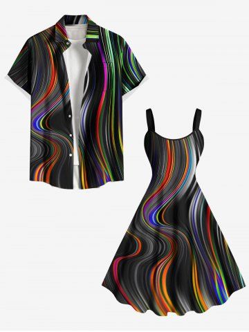 Plus Size Colorful Rainbow Light Beam Curve Print Hawaii Tank Dress - Black - S