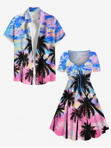 Graphic Dresses > Plus Size Colorful Sky Coconut Tree Oil Painting Print Cinched Hawaii Dress