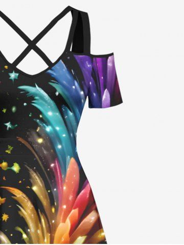 Graphic Dresses > Plus Size Colorful Stars Smoke Print Hawaii Cold Shoulder Crisscross A Line Maxi Dress