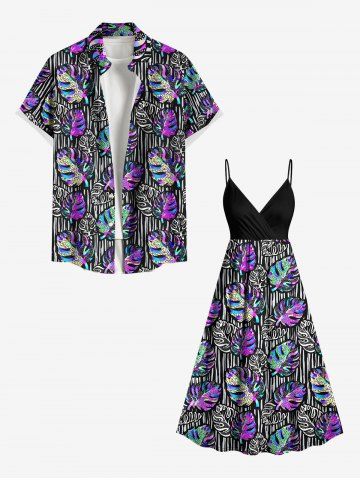 Plus Size Colorful Tropical Leaves Striped Background Print Hawaii Surplice A Line Cami Dress - Black - M