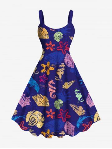Plus Size Conch Seahorse Starfish Shell Paint Print Hawaii Ombre A Line Tank Dress - Blue - 6x