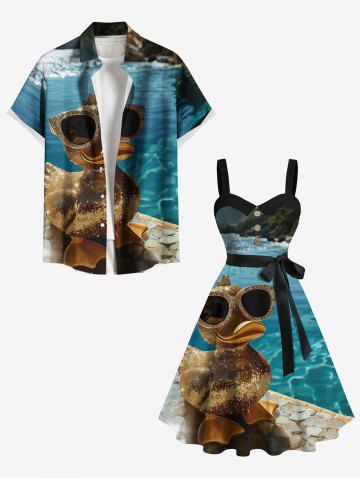 Graphic Dresses > Plus Size Cool Duck Sea River Print Hawaii Button A Line Dress with Removable Belt