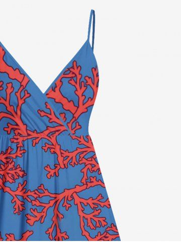 Plus Size Coral Branch Two Tone Print Hawaii Surplice A Line Cami Dress - Blue - 2x