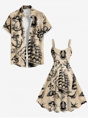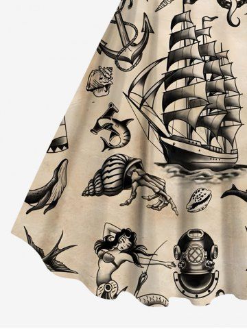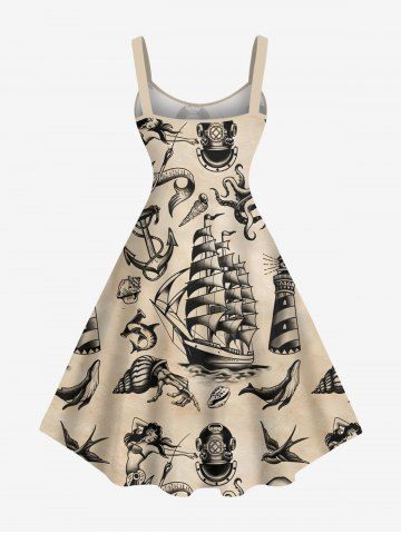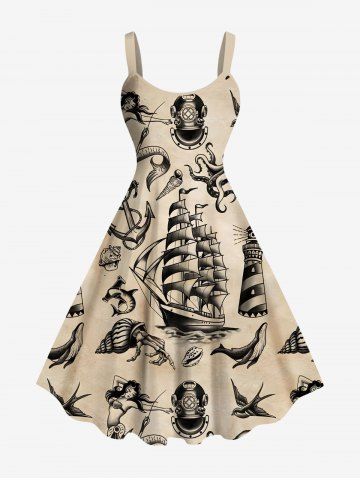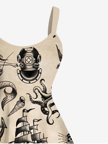 Plus Size Cruise Ship Mermaid Octopus Anchor Print Hawaii Tank Dress - Apricot - 1x