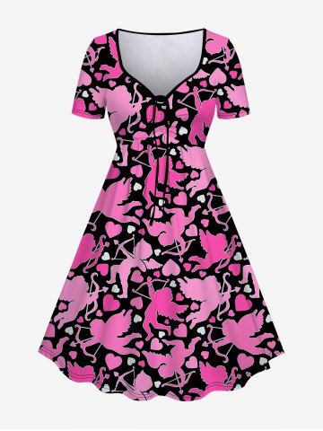 Graphic Dresses > Plus Size Cupid Heart Print Valentines Cinched A Line Short Sleeve Dress