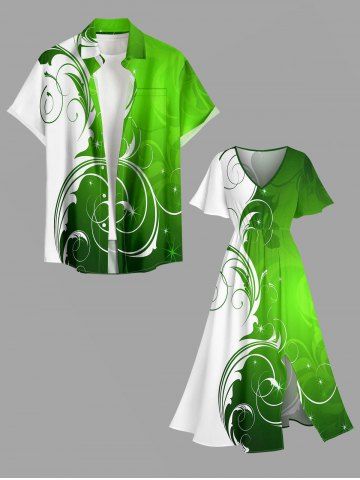 Plus Size Curve Branch Print St. Patrick's Day Hawaii Split Pocket A Line Midi Dress - Green - 1x