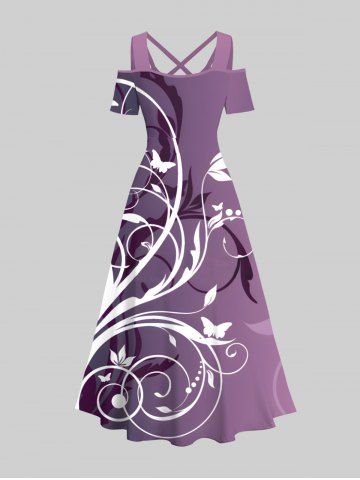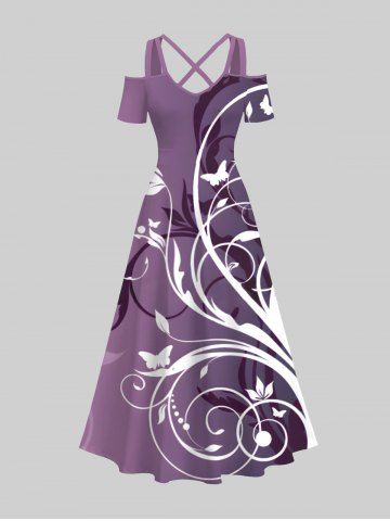 Plus Size Curve Floral Butterfly Print Hawaii Ombre Crisscross A Line Maxi Dress - Purple - M