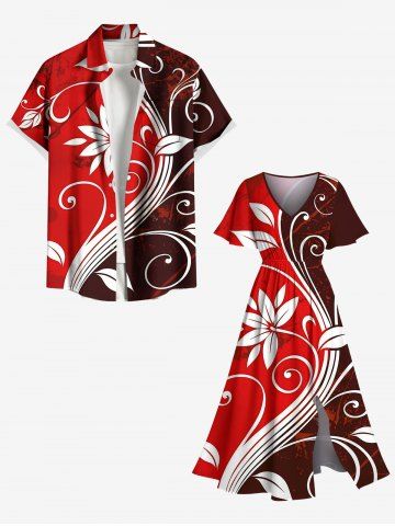 Plus Size Curve Flower Print Hawaii Split Pocket A Line Midi Dress - Red - S