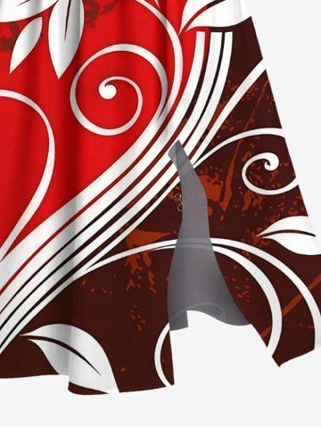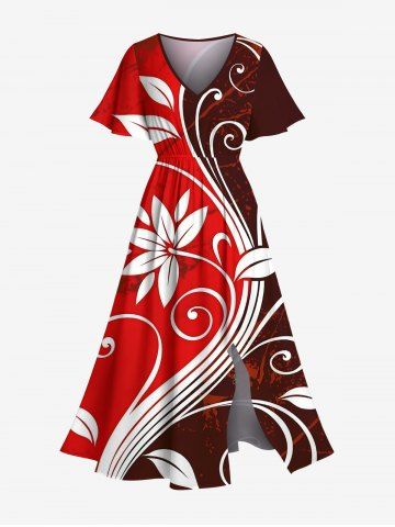 Plus Size Curve Flower Print Hawaii Split Pocket A Line Midi Dress - Red - 4x