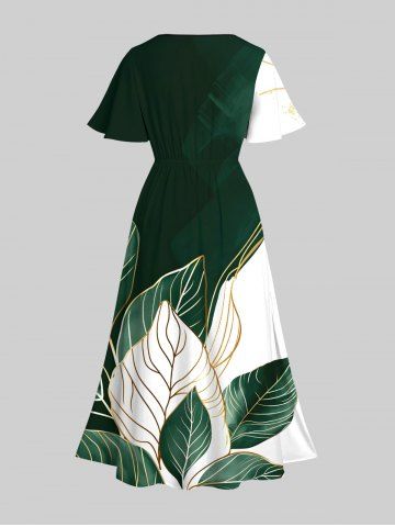 Graphic Dresses > Plus Size Curve Tropical Leaves Contrast Colorblock Print Hawaii Split Pocket A Line Midi Dress