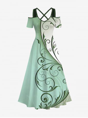 Plus Size Curved Line Floral Two Tone Print Hawaii Ombre Crisscross A Line Maxi Dress - Green - 5x