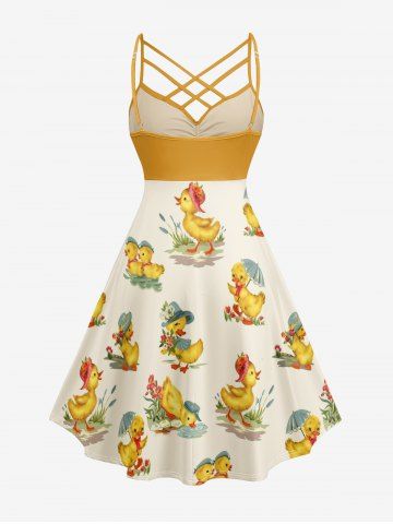 Plus Size Cute Duck Print Hawaii Ruched Crisscross Strappy A Line Cami Dress - Deep Yellow - Xs