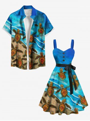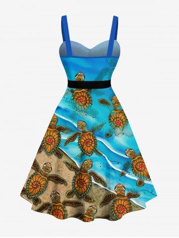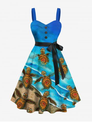 Plus Size Cute Turtle Sea Beach Print Hawaii Sea Creatures Ombre Turn-down Button A Line Dress with Removable Belt - Blue - 1x
