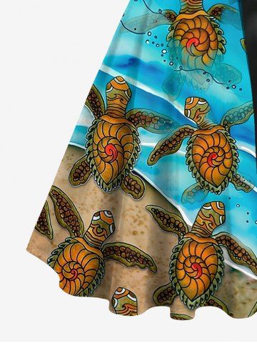 Graphic Dresses > Plus Size Cute Turtle Sea Beach Print Hawaii Sea Creatures Ombre Turn-down Button A Line Dress with Removable Belt