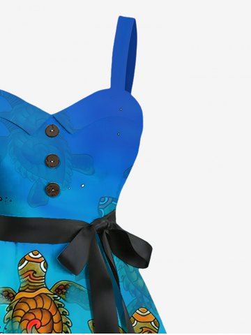 Plus Size Cute Turtle Sea Beach Print Hawaii Sea Creatures Ombre Turn-down Button A Line Dress with Removable Belt - Blue - 5x