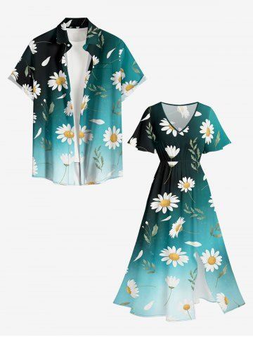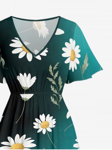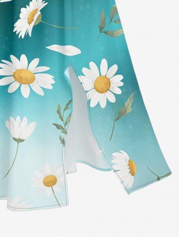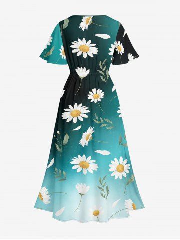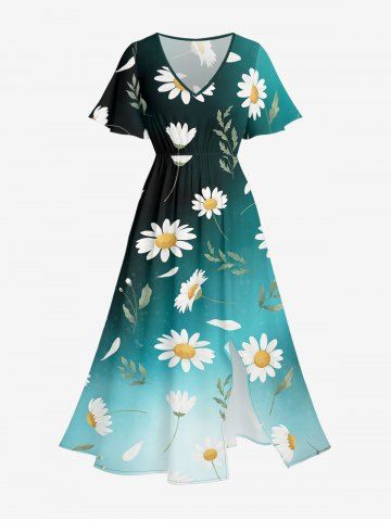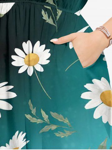 Plus Size Daisy Flower Dip Dye Ombre Print Hawaii Split Pocket A Line Midi Dress - Peacock Blue - 3x