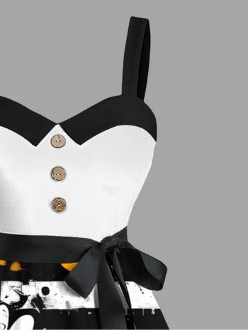Plus Size Daisy Flower Ink Painting Striped Print Hawaii Button A Line Dress with Removable Belt - Black - L
