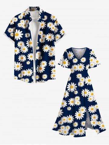Plus Size Daisy Flower Print Hawaii Split Pocket A Line Midi Dress - Deep Blue - 3x