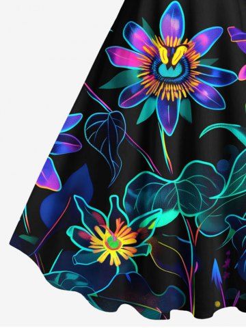 Plus Size Daisy Flowers Leaf Neon Print Hawaii Tank Dress - Black - Xs
