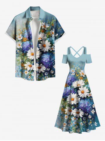 Graphic Dresses > Plus Size Daisy Flowers Leaf Oil Painting Print Cold Shoulder Crisscross Hawaii Maxi Dress
