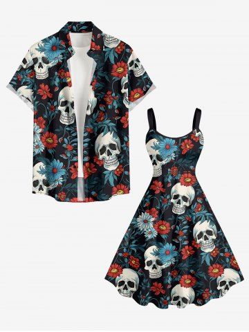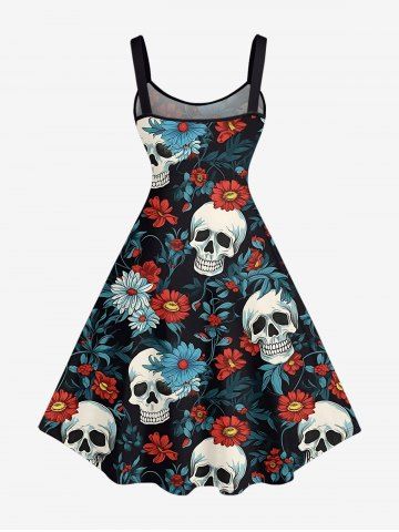 Plus Size Daisy Flowers Leaf Skull Print Hawaii Tank Dress - Black - S