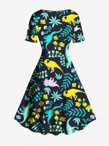 Plus Size Dinosaur Floral Leaves Branch Print Hawaii Vintage A Line Dress - Deep Blue - 2x