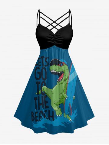 Graphic Dresses > Plus Size Dinosaur Letters Sea Waves Print Hawaii Ruched Crisscross Strappy A Line Dress
