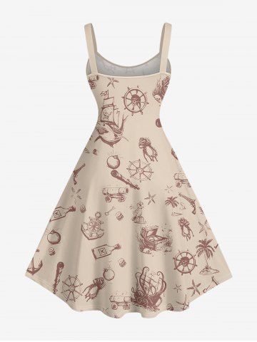 Plus Size Dinosaur Pirate Ship Rudder Print Hawaii Tank Dress - Tan - M