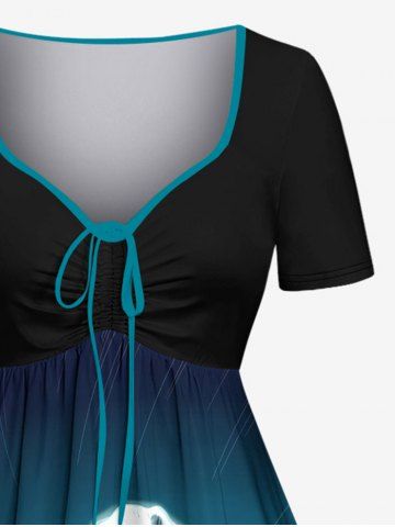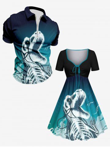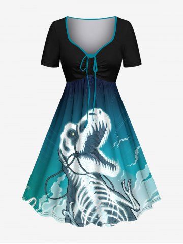 Plus Size Dinosaur Skeleton Ombre Sky Print Halloween Cinched A Line Dress - Black - L