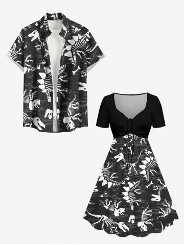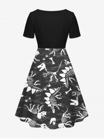 Plus Size Dinosaur Skeleton Print Cinched Hawaii Dress - Black - 3x