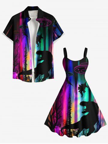 Plus Size Dinosaur UFO Ombre Aurora Print Hawaii A Line Tank Dress - Black - 2x