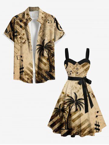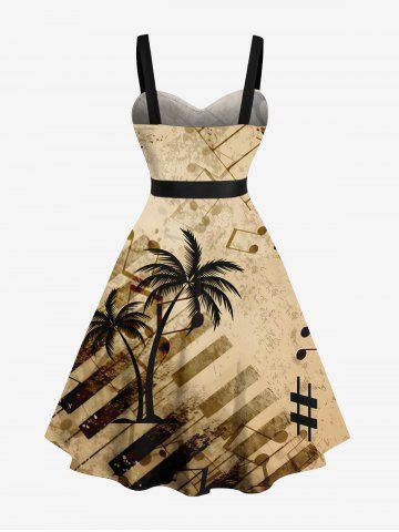 Plus Size Distressed Coconut Tree Music Symbol Piano Print Hawaii Turn-down Button A Line Dress with Removable Belt - Light Coffee - S