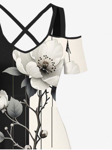 Plus Size Distressed Flower Leaf Branch Ombre Colorblock Print Hawaii Crisscross A Line Maxi Dress - Black - 4x