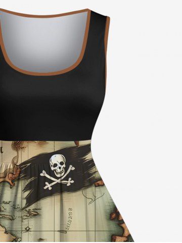 Plus Size Distressed Skull Sailboat Map Steering Wheel Print Hawaii Cruise 1950s Vintage Swing A Line Dress - Black - Xxs